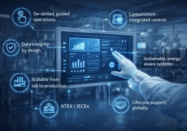 For HPAPI processing requiring contained environments: interlocked containment interfaces, automated WIP (wash-in-place) cycles with documented completion verification, and operator exposure minimisation built directly into equipment control logic. The automation enforces containment discipline – it does not depend on it.