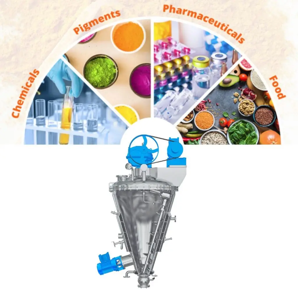 - Pharmaceuticals and API - blending of dry powders, granules, API with excipients; drying and solvent extraction of active ingredients; low-shear granulation